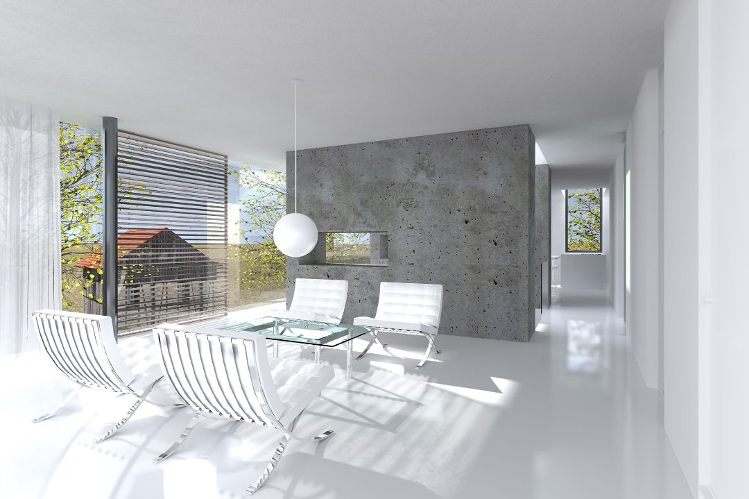Auf einem exponiert gelegenen Grundstück soll ein modernes Einfamilienhaus errichtet werden. Den Bauherren waren dabei besonders die Blickbeziehungen im Haus sowie in die umgebene Landschaft wichtig.