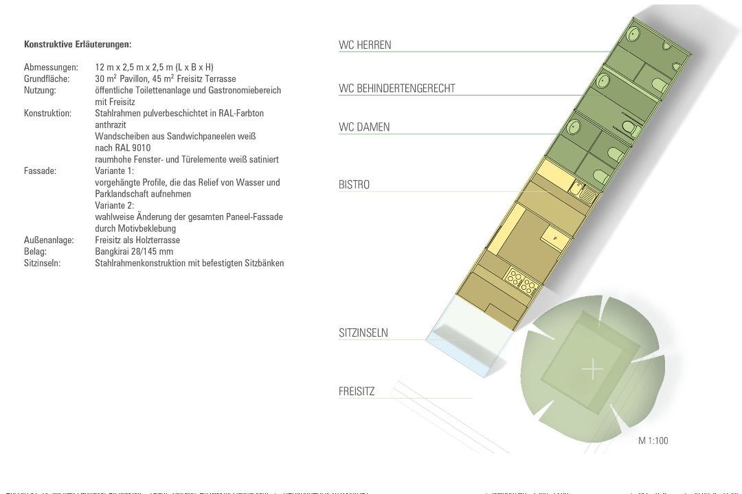 Unmittelbar an einer der Einfahrtsstraßen Nordhausens liegt der Park der Stadt. Im Zusammenhang mit der Revitalisierung der Teichanlagen sollte ein in den Sommermonaten genutzter Pavillon zur Versorgung der Gäste mit Küche, Ausgabe und Freisitz entstehen.