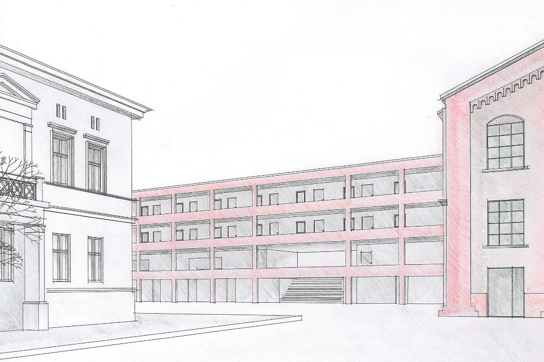 Um die im Entwurf von 1896 gewollte, symmetrisch-körperhafte Aussage des Baus zu erreichen, schlägt die Konzeption einen Rückbau der Schmiede auf den Grundentwurf vor.