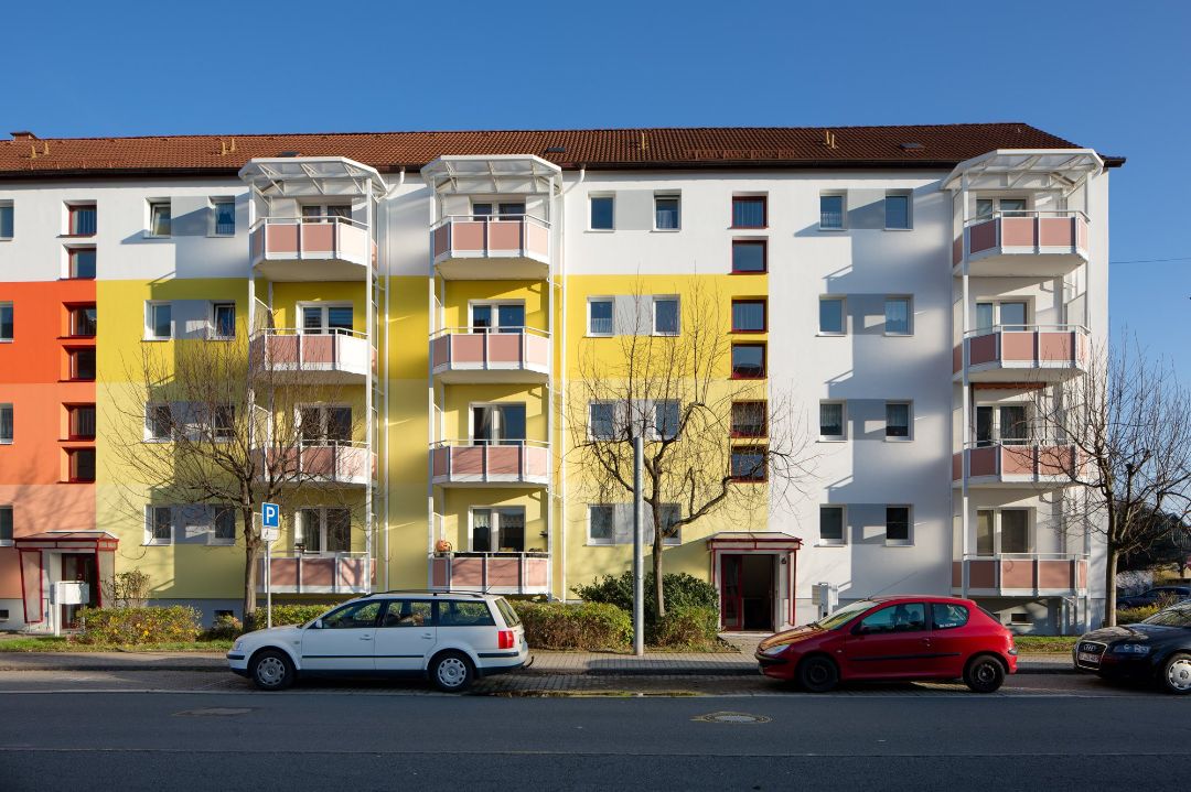 Bei diesem Projekt bestand die Herausforderung darin, mit vorhandenen farbigen Fenstern und Balkonen ein in sich stimmiges Farbkonzept zu entwickeln. Dabei fassten wir optisch die Lochfassade der ersten drei Etagen mit den Treppenhäusern zusammen und durchbrachen damit die vorherrschende Symmetrie. Das 4. Geschoss setzt sich von den unteren Etagen ab und mildert so die Höhe der Gebäude.